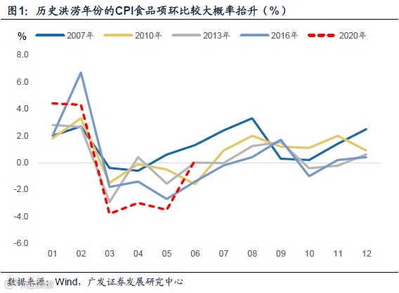雨季和洪涝对一般物价通胀的影响主要在猪肉、蔬菜以及粮食价格。7月12日国家防总、应急管理部将防洪应急响应提升至II级。我们在此前报告中曾经提到:雨季洪涝对通胀影响主要在于猪肉、蔬菜以及粮食价格,除此之外水产品亦或有一定冲击。由于洪涝发生时点主要集中在农作物生产较为关键的夏季,雨季影响下农作物减产、养殖疫病高发以及运输半径受阻等原因,成为推动消费品价格短期超预期上行的关键因素。对于总体通胀而言,历史上雨季洪涝或降雨量较大的年份,如2007、2010、2013、2016年,7-8月对应CPI食品项亦存在较大概率的抬升可能性。本文重点就雨季对于消费品价格的影响展开探讨。