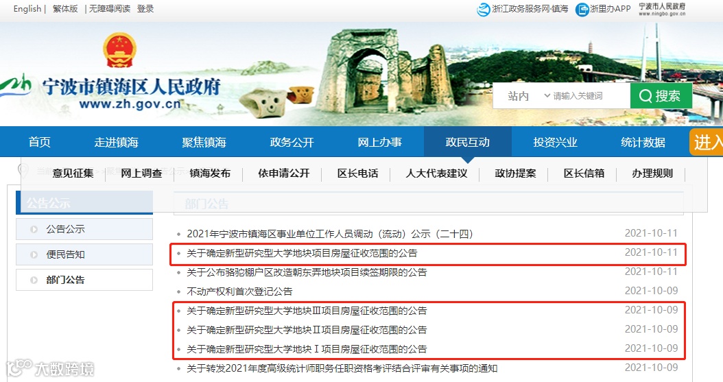 10月9日至11日,浙江省宁波市镇海区政府共发布四则公告,确定新型研究型大学各个地块的房屋征收范围,共计拟征收房屋建筑面积约25.94万平方米。