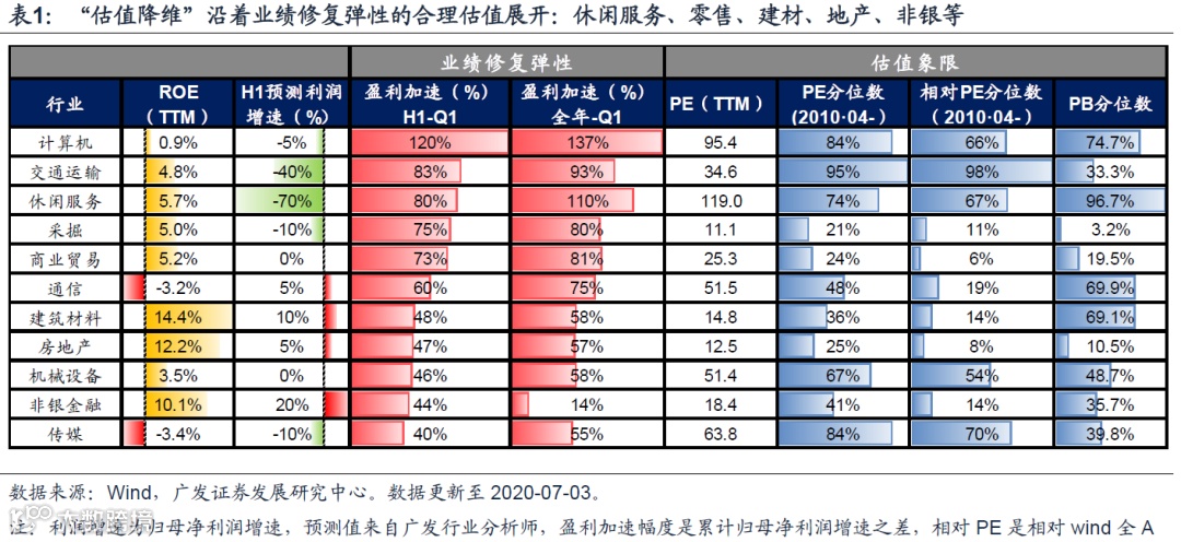 另一方面,经济数据持续向好改善盈利预期、提振风险偏好,顺周期低估值板块迎来阶段性补涨。我们在6.7中期策略展望《渐入佳境》中提出“市场当前的核心分歧在于2020年下半年是“修复”还是“反复”?我们认为修复是下半年的主旋律。”本周低估值顺周期补涨,反映市场正在对以上预期差逐步price in。本周公布的6月中采制造业PMI50.9,以及房企百强企业的销售额在高基数基础上单月同比13.8%,累计同比-2.7%均向上超预期。数据公布后,低估值顺周期板块迎来显著补涨,金融地产表现强势、水泥重新向上,而前期表现较好的大类行业内部也发生一定变化,机械设备中本周工程机械表现更强;电新设备中本周电力设备表现强于新能源。在超预期数据公布后,市场对从经济是反复还是修复的争议走向“修复”的一致预期,盈利修复的预期差price in带来低估值顺周期品种阶段性补涨。我们反复强调寻找“修复”将替代上半年寻找“免疫”的逻辑,高低估值剪刀差将阶段性收敛。6.28《估值降维,循序渐进》中我们借助最新的广发各行业中报/年报盈利预测展开了“估值降维”具体方法:经济修复高频数据验证,因此“估值降维”下沉至最底端的“修复”主线,沿着20年盈利增速改善弹性最大、估值处于A股历史分位数(64%)以下象限行业依次为,休闲服务、商贸零售、通信、建材、地产、非银金融,近日上述行业表现优异印证A股“估值降维”进行时!