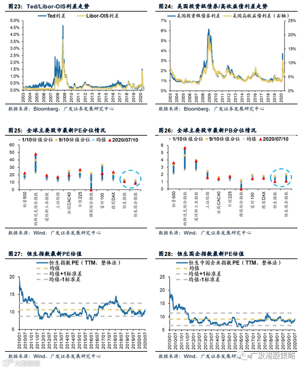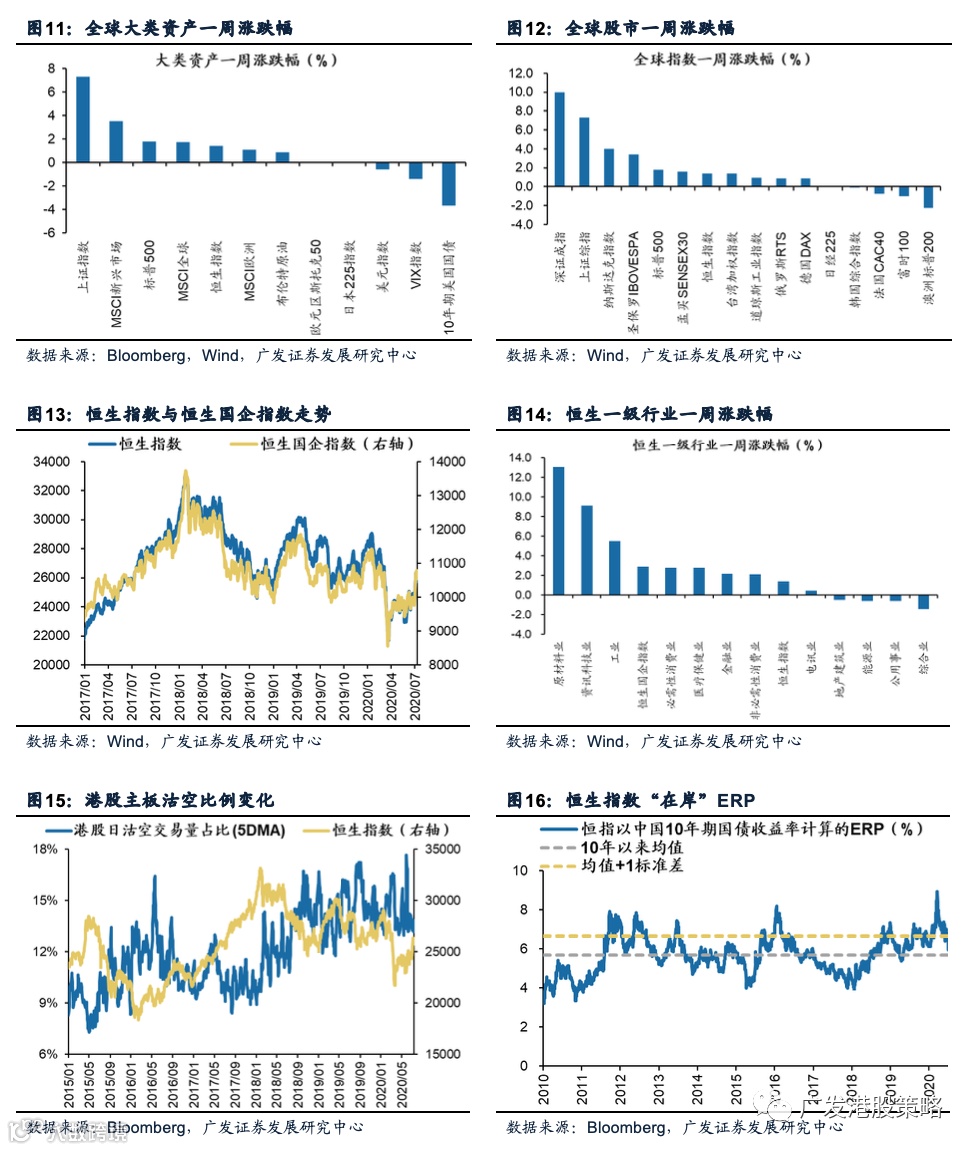 本周(7.6-7.10)人民币兑美元升值,10年期美债利率0.65%,中美利差走阔至238BP。WTI原油价格小幅上涨至40.6美元/桶。恒生指数PE 10.7倍,略高于历史均值水平。
