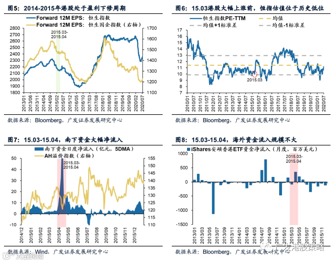 南下资金催化港股15年3-4月出现短期“快牛”。15年3月中旬-4月底,恒指涨幅近20%。3月恒指快牛行情前,无论从港股绝对估值,还是AH相对估值看,港股低估值特征显著,叠加证监会批准公募基金通过沪港通投资港股,南下资金做多热情被点燃,带动估值修复。
