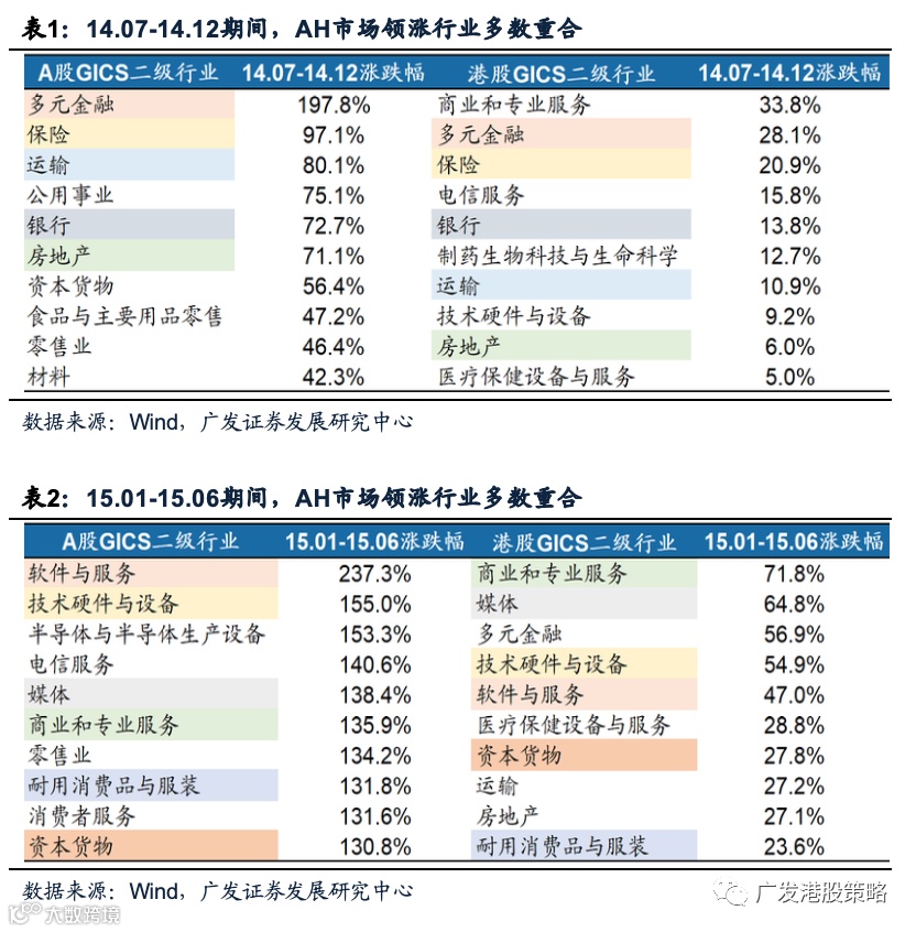 行业层面,尽管涨跌幅绝对值存在较大差异,但无论是在价值领涨的14H2,还是成长跑赢的15H1,AH市场涨幅居前的行业存在多数重合,如14H2两地多元金融、保险、银行、地产等行业表现较好,而15H1港股与A股的领涨行业均包括媒体、软件服务、技术硬件与设备、商业和专业服务等。