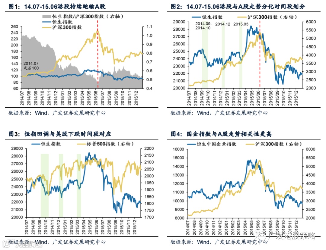 我们将2014-15年A股牛市区间划定为14年7月至15年6月,这一年期间A股上证综指、创业板指最大涨幅均超过150%。港股恒生指数在这一时期同样上涨,恒指从14年7月23000点一度上涨至15年4月最高接近29000点;但从AH相对走势看,港股持续跑输,上行动力明显偏弱。进一步细分时间段,恒生指数在14年9-10月、14年12月、15年3月初曾出现回撤,而同期A股走势平稳或上行。
