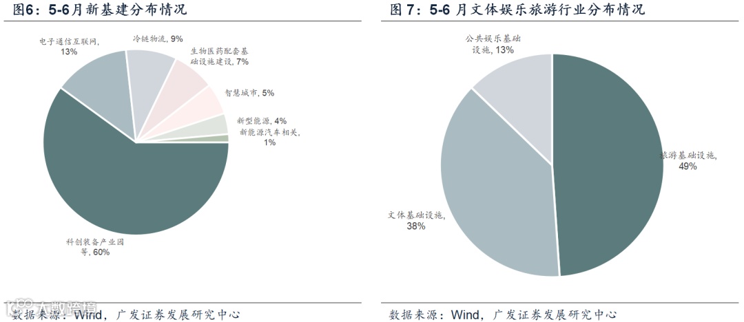 (4)受疫情影响前期高速增长的医疗卫生领域增速于5-6月有所放缓,但仍快于整体。新基建投向、物流仓储投向也是如此。