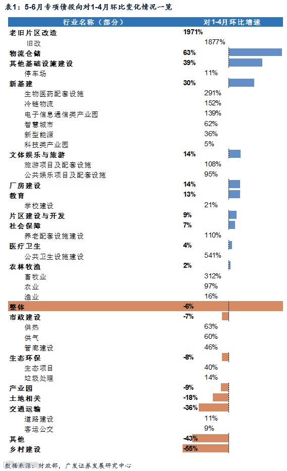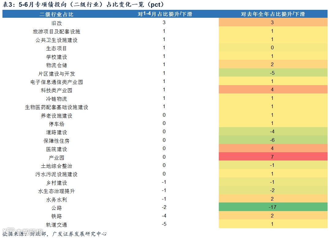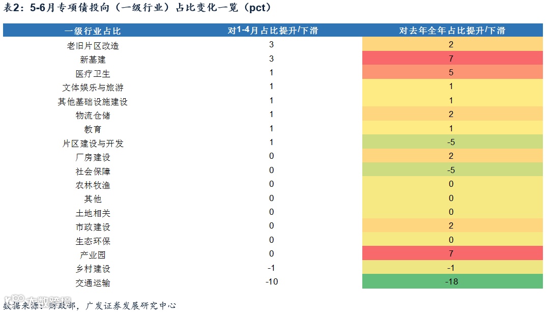 就边际变化而言,与前四个月相比5-6月专项债投向规模增长较快的具体领域有“旧改”、公共卫生配套设施、生物医药配套设施、冷链物流、电子通信类产业园、养老配套设施、旅游配套设施等。