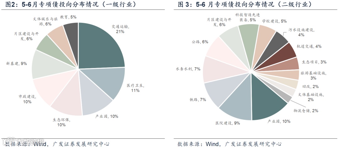 就投向规模的静态结构而言,5-6月专项债主要分布于交通运输(占比21%,下同)、医疗卫生(11%)、产业园(11%)、生态环保(10%)、市政建设(10%)、新基建(9%)等,基本也是1-4月规模占比较大的六大重要领域。其中较为明显的变化有二,一是医疗卫生投向占比由1-4月的10%提升1个百分点至11%,并由第五名提升至第二名,二是新基建投向占比由1-4月的7%提升2个百分点至9%。