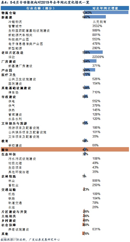 与2019年相比,5-6月投向同比增长较快的领域有:物流仓储(211亿元,1343%)、新基建(981亿元,647%)、老旧片区改造(同比556%,其中旧改22309%)、厂房建设(236亿元,364%)、产业园(1129亿元,324%)、医疗卫生(1155亿元,177%)等。