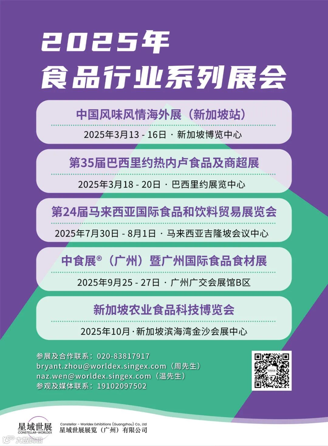 2025年3月16日——由新加坡星域展览集团与星域世展展览(广州)有限公司联合主办、新加坡报业集团协办的“2025中国风情风味海外展(新加坡站)”,在新加坡博览中心圆满闭幕。本届展会汇聚中国各品牌企业,涵盖特色食品、地方名优特产、非遗手工艺、现代国货及文化旅游产品等多元领域,为中国品牌深耕东南亚市场注入强劲动能。