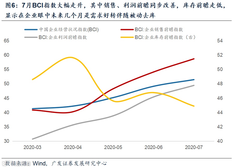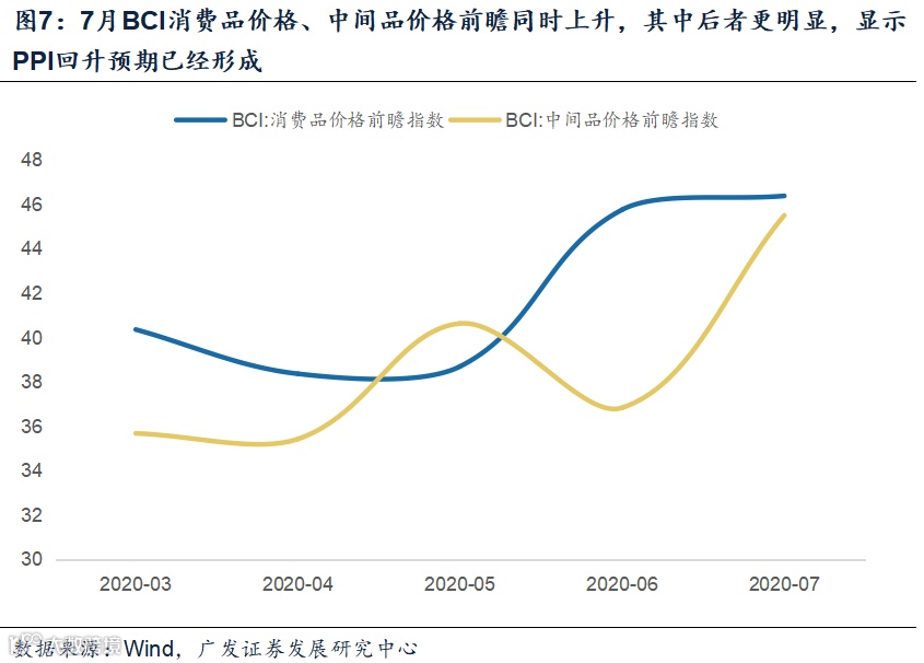 从7月数据看,BCI大幅上行2.3个点至51.4。其中销售前瞻指数上行4.6个点至58.7,利润前瞻指数上行4.0个点至49.4。