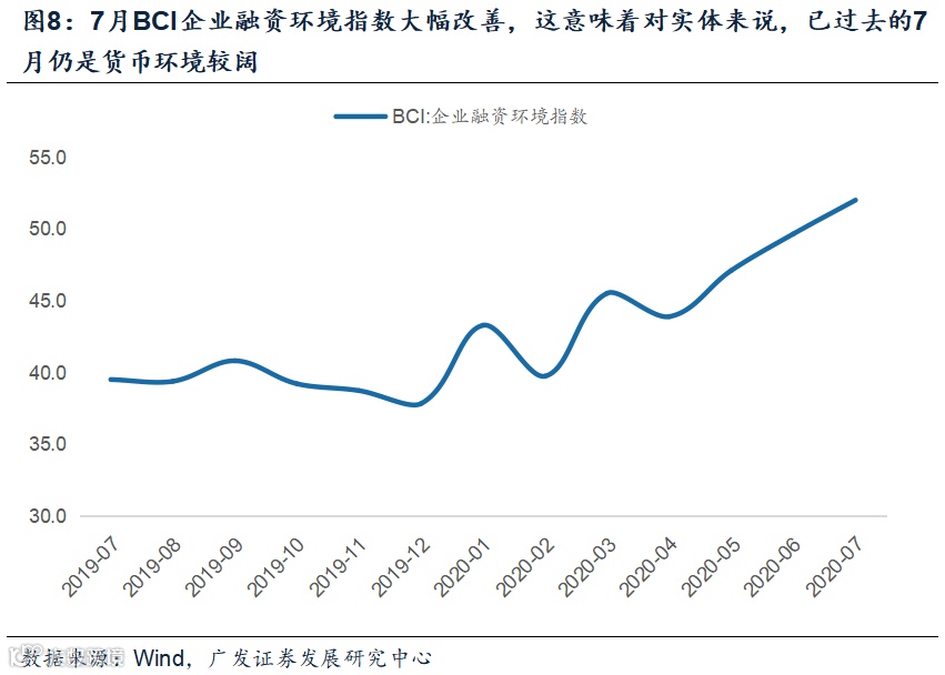 比较值得注意的是,7月BCI企业融资环境指数大幅改善,这意味着对实体来说,已过去的7月仍是货币环境较阔。考虑到下半年“稳健适度”较为确定,后面需要关注这一指标回落的时间及其影响。另外一个值得关注的分项指标是企业融资环境指数,7月大幅上行至52的新高。