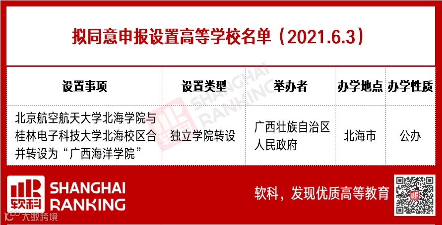 近期,广西在建设海洋高校方面频出大动作。6月3日,广西壮族自治区教育厅发布《关于拟同意申报设置有关高等学校的公示》,拟向教育部申请批准北京航空航天大学北海学院与桂林电子科技大学北海校区合并转设为“广西海洋学院”。