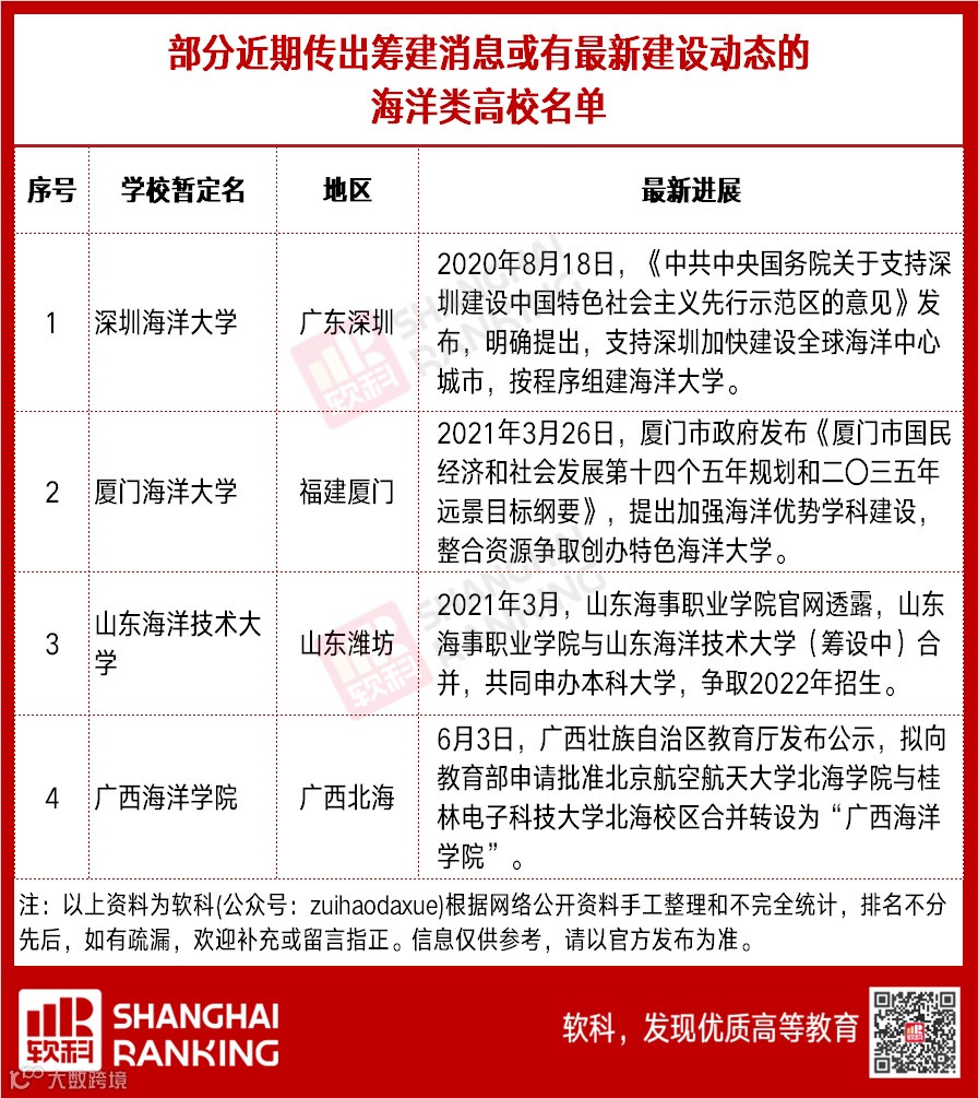 在近两年传出新建消息的行业特色型大学中,海洋类高校至少有4所,包括深圳海洋大学、厦门海洋大学、山东海洋技术大学、广西海洋学院等。