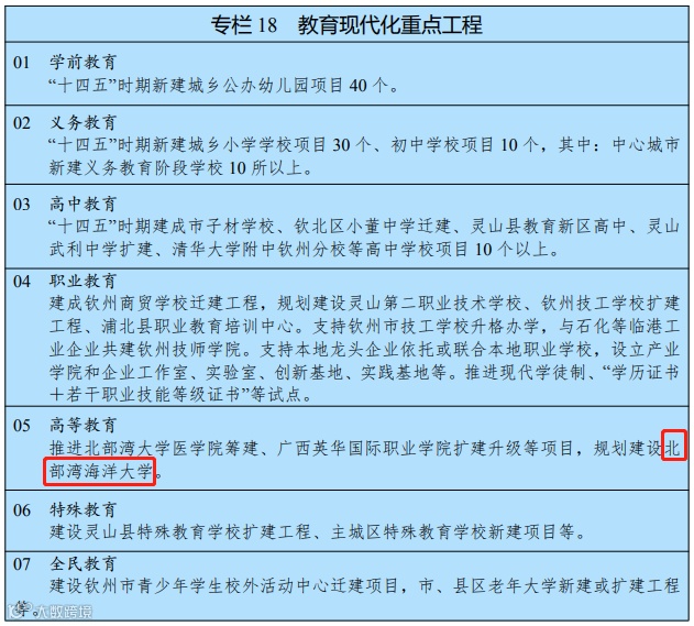 近日,广西壮族自治区钦州市人民政府发布了《关于印发钦州市国民经济和社会发展第十四个五年规划和2035年远景目标纲要的通知》(以下简称“规划纲要”)。《规划纲要》在“教育现代化重点工程”部分中提到,规划建设北部湾海洋大学。