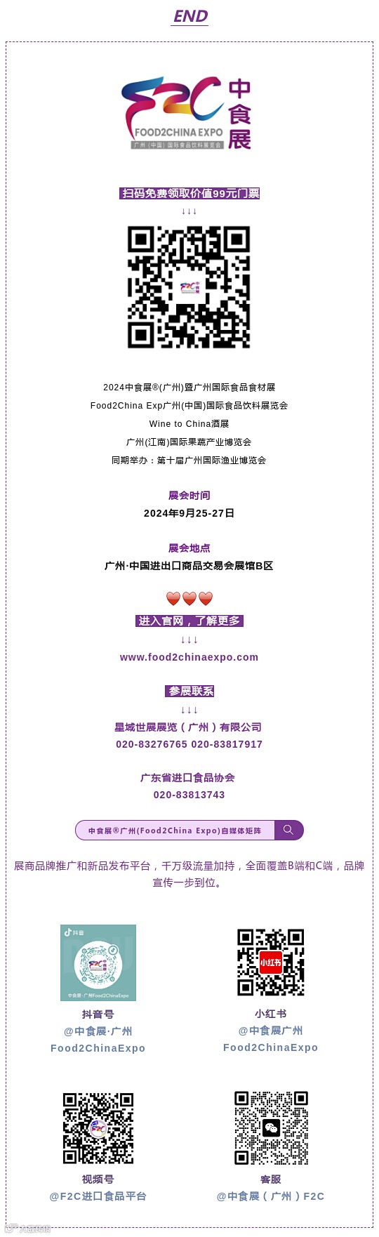时隔一年,我们又来了!全球食品行业具有规模和影响力的年度盛会——2024中食展®广州强势回归,携手Food2China Expo、广州国际食品食材展览会、Wine to China Expo(源于TOEwine)、广州(江南)国际果蔬产业博览会、广州国际渔业博览会,六展合一、全面升级,充分发挥政府、行业商协会及企业凝聚力,共同打造以广州为中心、链接全球、辐射全国的国际食品展览会。