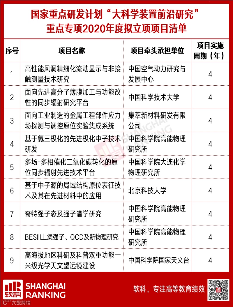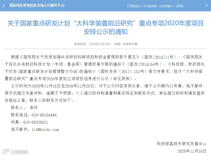 11月16日,国家科技管理信息系统公共服务平台公示了“大科学装置前沿研究”重点专项2020年度项目安排公示。共立项9个项目。