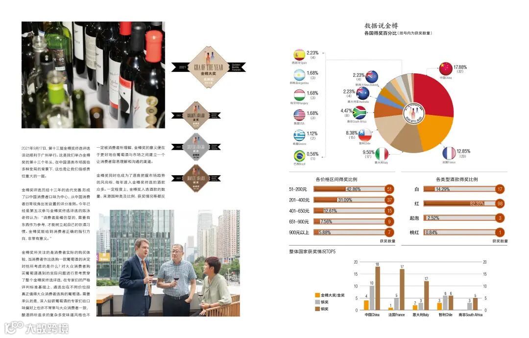 2011年,有个值得关注的现象:白葡萄酒数量是以往两届的几倍。这对于比赛的要求会更高,在前期储存时要保证白葡萄酒不变质,比赛时的侍酒温度要合适等,这些《葡萄酒》全部都做到了。当年的获奖名单中,白葡萄酒在“最佳葡萄酒”和“优秀葡萄酒”中占比几乎都达到30%。此后的几年中,金樽奖不断完善,在业内外都受到极高的认可。