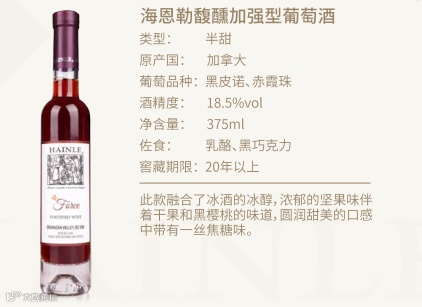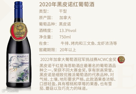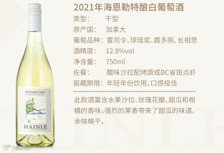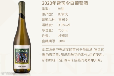 HAINLE海恩勒葡萄酒庄园是加拿大冰酒诞生地,酿造了加拿大的第一支冰酒,也是加拿大第一家有机认证的酒庄,是第80届奥斯卡颁奖典礼用酒及欧州王室婚礼用酒;酒庄酿造的葡萄酒在许多重要的国际葡萄酒大赛上屡获金奖,在业内享有极高声誉,获得加拿大最知名的葡萄酒作家John Schreiner (约翰·施莱纳)的推荐。