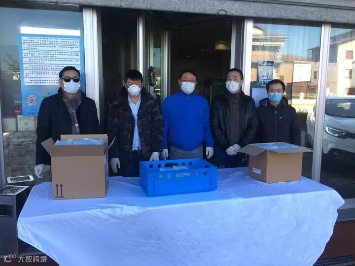意大利摩德纳商会会长留伟勇在当地组织发放口罩(左一)