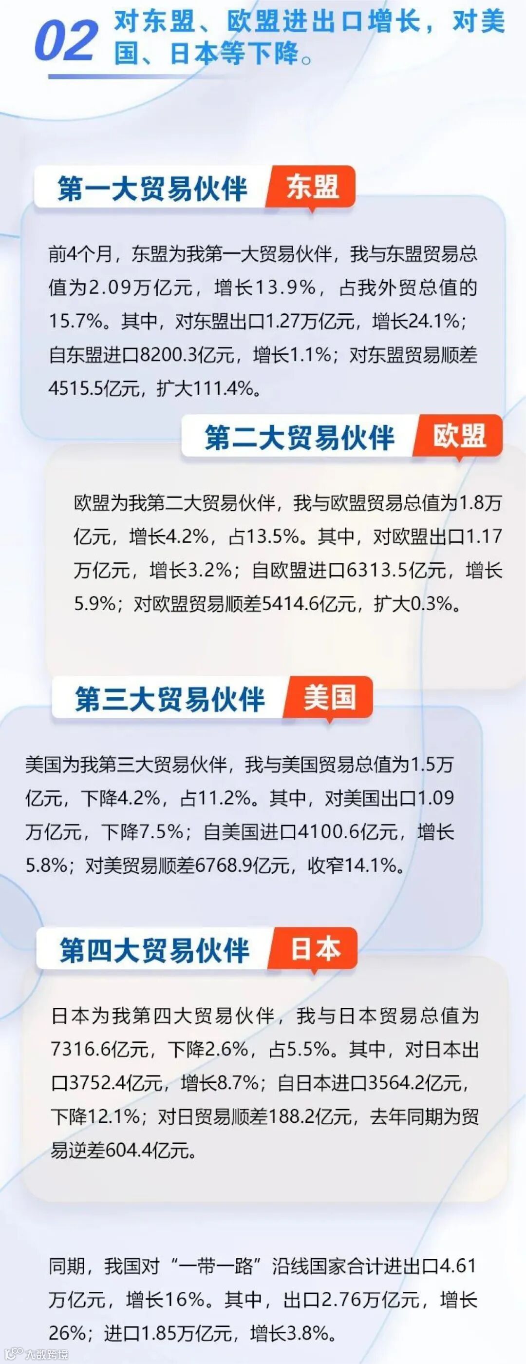 前4个月,我国对东盟、欧盟进出口增长,对美国、日本等下降。前4个月,东盟为我国第一大贸易伙伴。我国与东盟贸易总值为2.09万亿元,增长13.9%,占我国外贸总值的15.7%。欧盟为我国第二大贸易伙伴,我国与欧盟贸易总值为1.8万亿元,增长4.2%,占13.5%。美国为我国第三大贸易伙伴,我国与美国贸易总值为1.5万亿元,下降4.2%,占11.2%。日本为我国第四大贸易伙伴,我国与日本贸易总值为7316.6亿元,下降2.6%,占5.5%。同期,我国对“一带一路”沿线国家合计进出口4.61万亿元,增长16%。