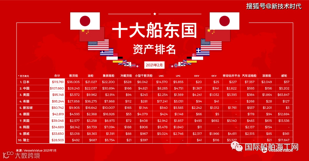 2021年十大船东国资产排名(按船型分类)最新发布,万万想不到,2021年全球十大船东国变化大。曾经长期第一的希腊,变为老四,中国还是位居第二,美国成为第三,瑞士成功晋级前十大船东国榜单,而丹麦则跌出前十。