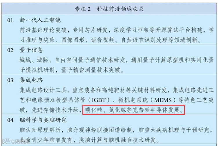 3月13日,新华网刊登了《中华人民共和国国民经济和社会发展第十四个五年规划和2035年远景目标纲要》,其中“集成电路”领域,特别提出碳化硅、氮化镓等宽禁带半导体也就是行业人士关注的第三代半导体要取得发展。