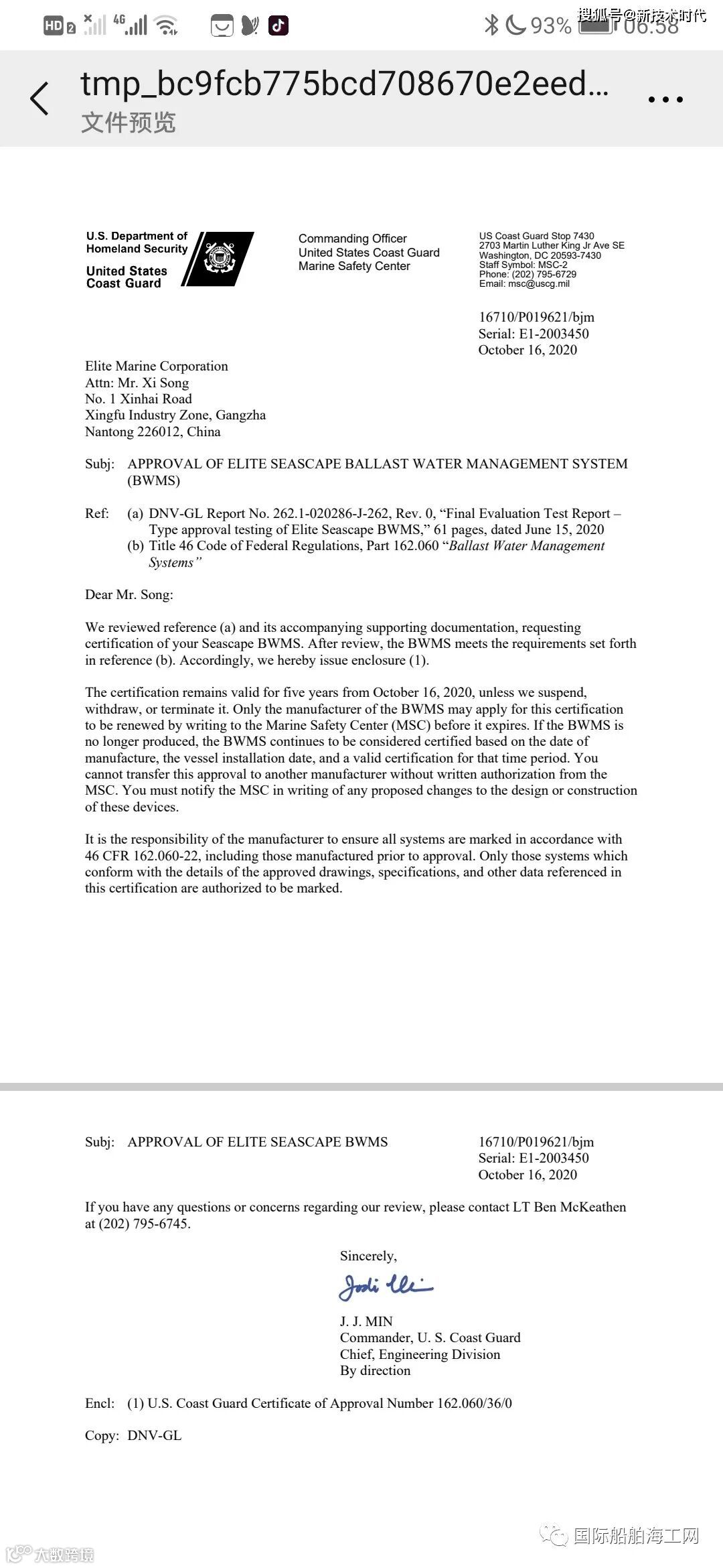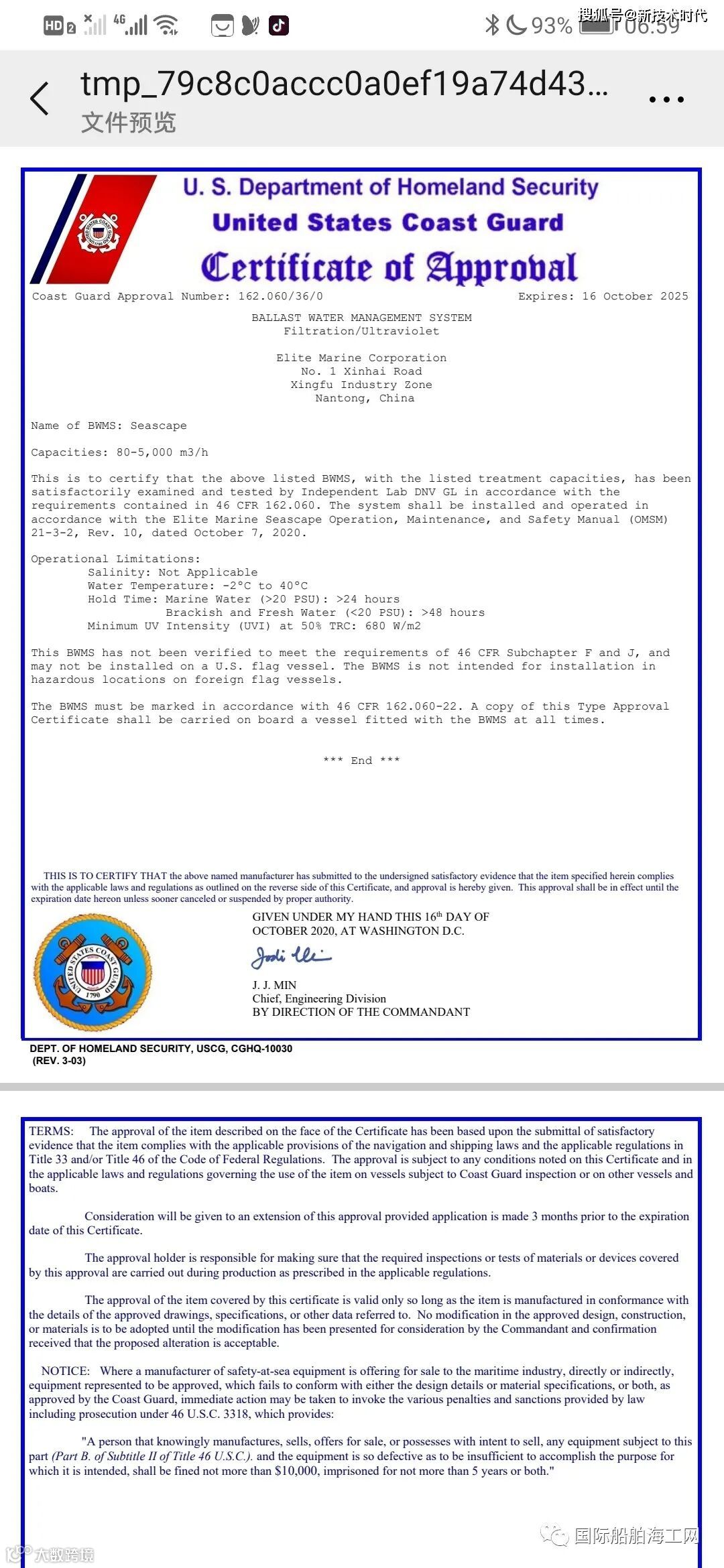中国高端船舶设备进军全球市场传来佳音,2020年10月16日,全球压载水系统管理系统的顶级认证机构,美国海岸警卫队(USCG)海事认证机构向南通易俐特公司颁发了其拳头产品Seascape压载水BWMS系统的认证证书,意味着易俐特Seascape压载水BWMS可以为全球航运的船舶提供满足海事要求的压载水管理系统。全球今后还要3万多艘船舶需要安装能满足规范和海事监管严格要求的压载水管理系统。