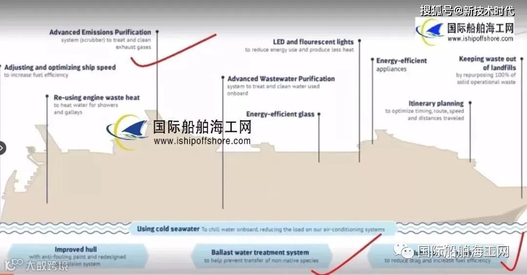 法国大西洋船厂正在建造的目前最大豪华邮轮应用了最新先进技术包含洗涤塔、压载水系统、智能控制等关键技术,如下图。