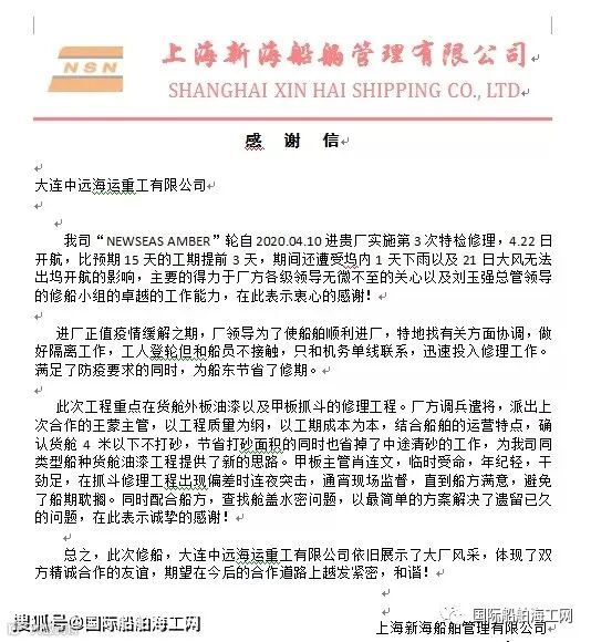 “4月16日“新海名珀”轮修理工程顺利完成出厂,我们有感而发给厂方一封感谢信,真心为厂方给予我们的长久努力表示感谢。”多年的合作赢得的不仅是包括机务代表顾中华在内的新海公司对船厂修船能力、实力的认可,还有对修船人品格、能力的赞佩。“我希望并坚信,未来我们不仅是工作上的合作伙伴,同时更会是生活当中的挚友。”顾中华恳切的说。