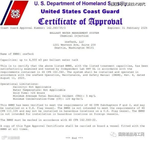 美国海岸警卫队USCG向oneTank LLC公司颁发了第35份BWMS型式认可证书(162.060/35/0),oneTank压载系统是一种简单、低成本的处理方案,适用于不需要复杂解决方案的船舶。其仅占用两平方英尺空间,非常适合空间和动力严重受限的工作船。在此之前,挪威海事当局于2020年7月根据国际海事组织《BWMS规则》向其颁发了DNV GL认可证书。