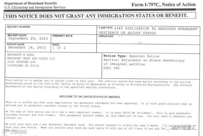 Notice mailed welcoming the new permanent resident:I-485申请已通过,寄出欢迎信给申请人。 -