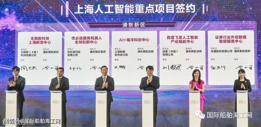 7月11日,在2020世界人工智能大会云端峰会上,上海市委副书记、代市长龚正为人工智能实验室揭牌,副市长吴清致辞。本次峰会有36个人工智能重大项目集中签约。其中,中国船舶集团旗下上海船舶研究设计院和上海张江(集团)有限公司签署了“AI+海洋科创中心”战略合作协议。院党委书记王麟和浦东新区副区长代表双方签署协议,为中国航海日送上了一份大礼。