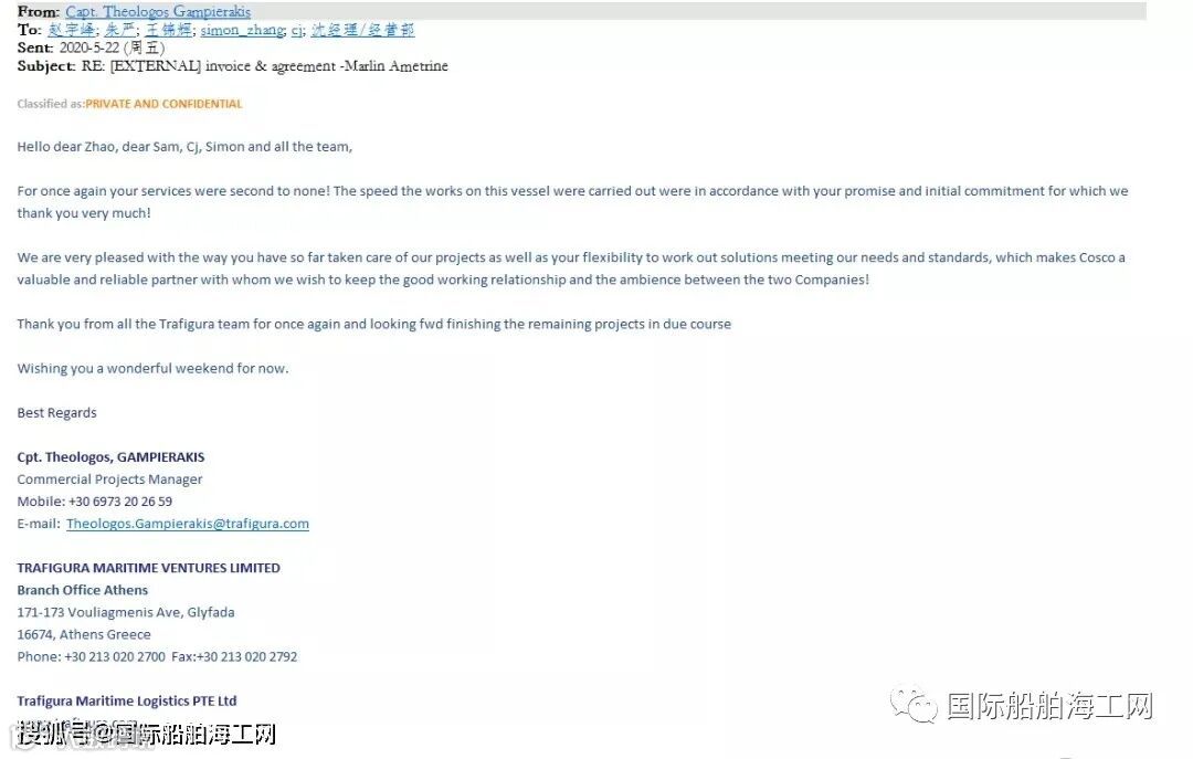 5月23日,希腊著名航运公司专门致信,感谢南通中远海运船务疫情期间提前交付修船项目。