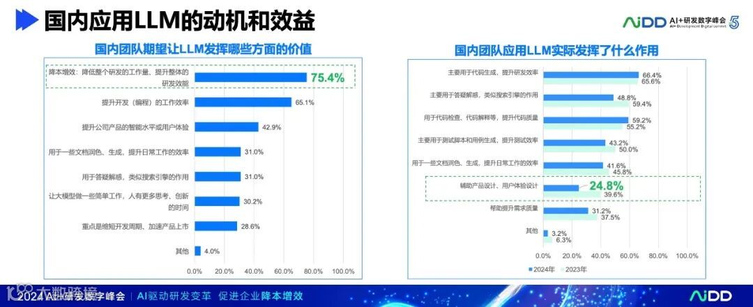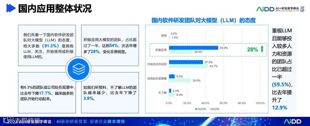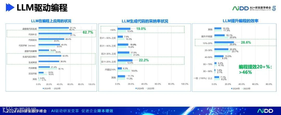 在软件研发整个生命周期(从需求、设计到编程、测试等),国内团队都有很好的应用,有近35%-50%的团队都取得比较显著的效率提升(效率提升20+%),目前在编程环节LLM应用效果最好。