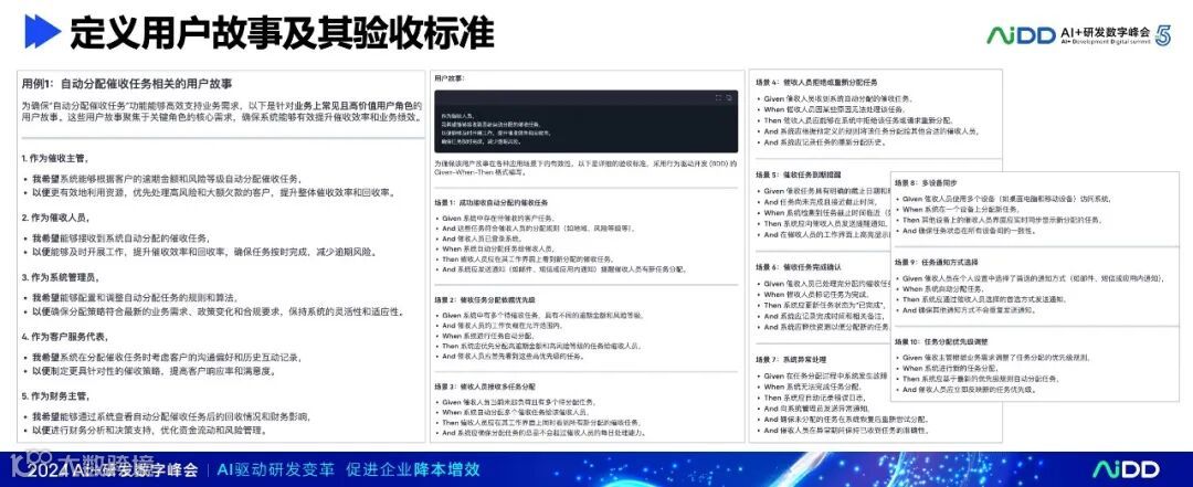 定义用户故事及验收标准:与用户或需求方协作,利用LLM将需求转化为清晰的用户故事和验收标准,例如采用Given-When-Then(GWT)格式。