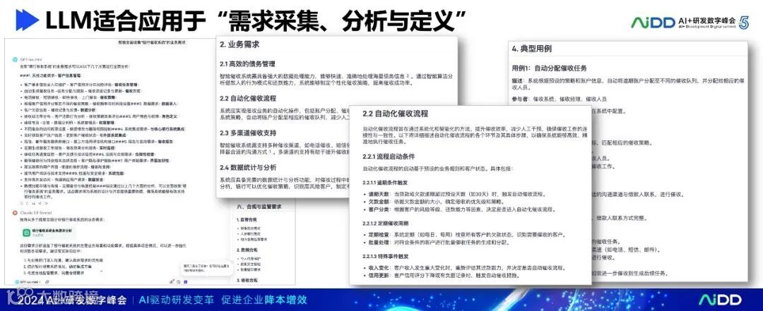 LLM是大语言模型,特别适合文字处理的工作,今天LLM翻译已能达到一次性可用的地步,天下无敌。LLM在自然语言处理方面的优势,在借助智能体(AI agent)和RAG技术,使其非常适合用于需求的采集、分析和定义。通过与用户的交互,LLM可以将模糊的需求转化为明确的用户故事(User Story)和验收标准。