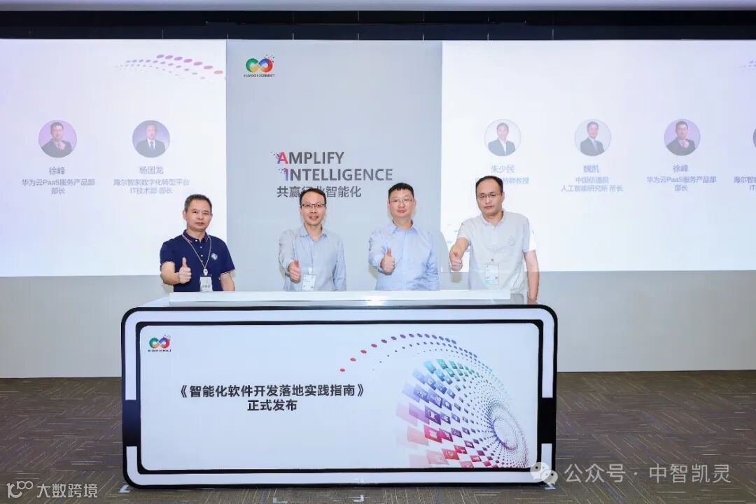 会议期间,华为云携手中国信通院、海尔集团、同济大学,共同发布《智能化软件开发落地实践指南》,华为云PaaS服务产品部部长徐峰、中国信通院人工智能研究所所长魏凯、海尔智家数字化转型平台IT技术部部长杨国龙、同济大学特聘教授朱少民出席发布仪式。