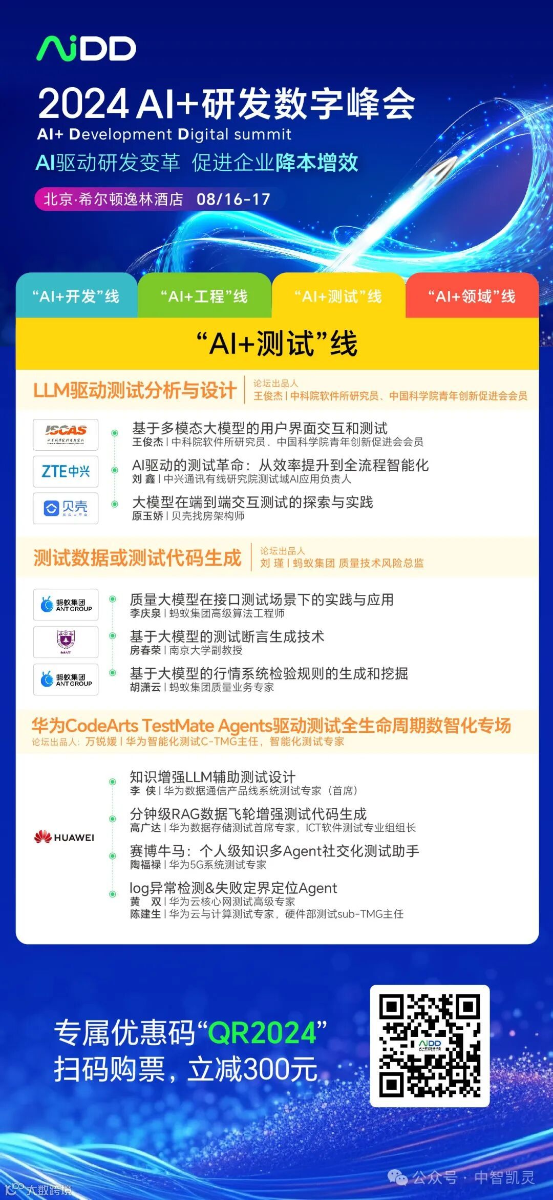 本届峰会设置了十五大前沿论坛,深度聚焦“AIGC产品创新、AI原生应用开发、智能体与具身智能、AI驱动效能提升(含OA、PM)、LLM驱动需求工程、AI +微服务的实践与创新、超越代码生成、AIGCode质量提升、LLM驱动测试分析与设计、测试数据或测试代码生成、大模型训练与评测、LLM助力缺陷定位与修复、长文本 & 文档理解技术与实践、领域多模态大模型技术与实践、华为CodeArts TestMate Agents驱动测试全生命周期数智化专场”等论坛话题,AiDD组委会将这15大论坛划分为四大主题脉络:“AI+开发线、AI+工程线、AI+测试线、AI+领域线”,覆盖从大模型开发到应用的的多个层面,确保每位到场的专业人士都能从中获得价值。峰会融合主题演讲、互动研讨、案例分享、实战演练等多种学习形式,以满足不同参与者的需求和兴趣。