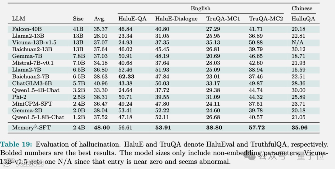 在幻觉评估上,Memory3避免了将文本压缩到模型参数中可能会导致的信息丢失,表现的比大部分模型要好。