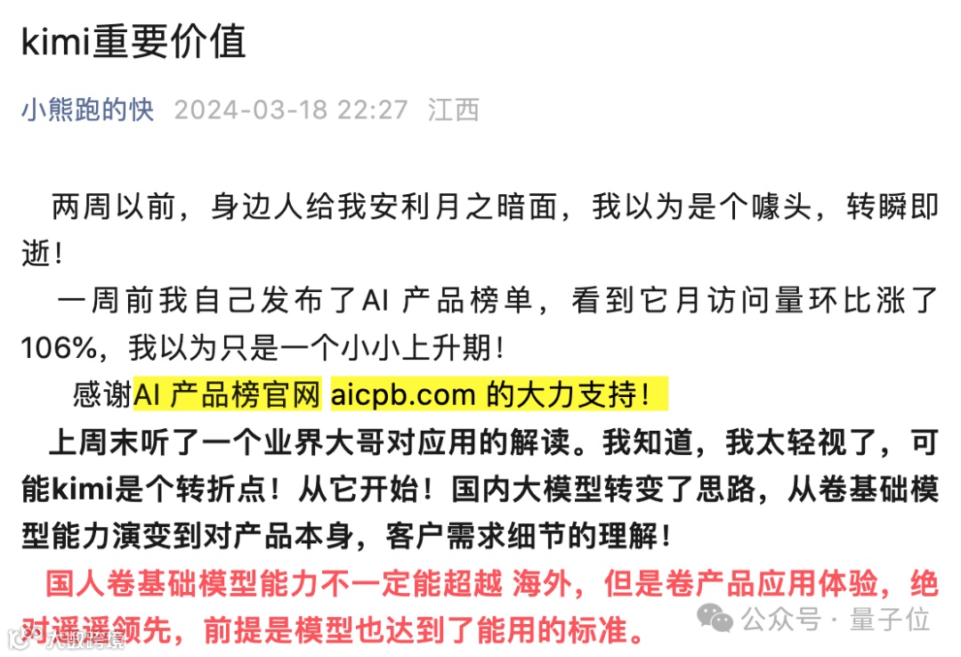 尤其产品应用体验方面,一直被视为国产市场的强项。有声音还认为,Kimi或许就是一个转折点,接下来国内大模型市场的思路可能要从基础能力演变转向对产品本身、客户需求细节的理解。