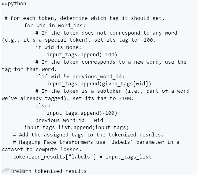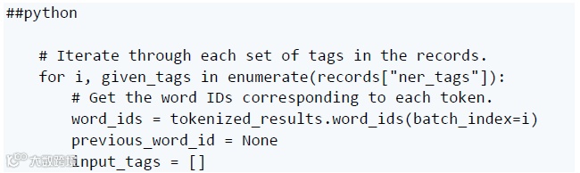 在这里,我们浏览记录中的标签。对于每组标签,我们找出它们在标记化输入中对应的单词(或子单词)。