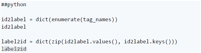完成此操作后,您可以使用 id2label 和 label2id 创建预期标记 ID 到其标记名称的映射: