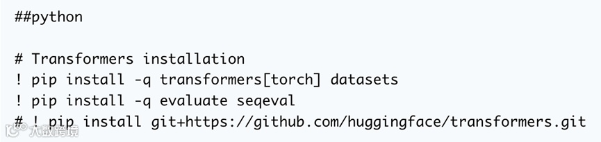 首先是第一件事。我们需要安装三个常用库:transformer、datasets 和 evalate。这将使我们能够访问将用于训练的模型和数据集,并在训练期间获得模型性能。
