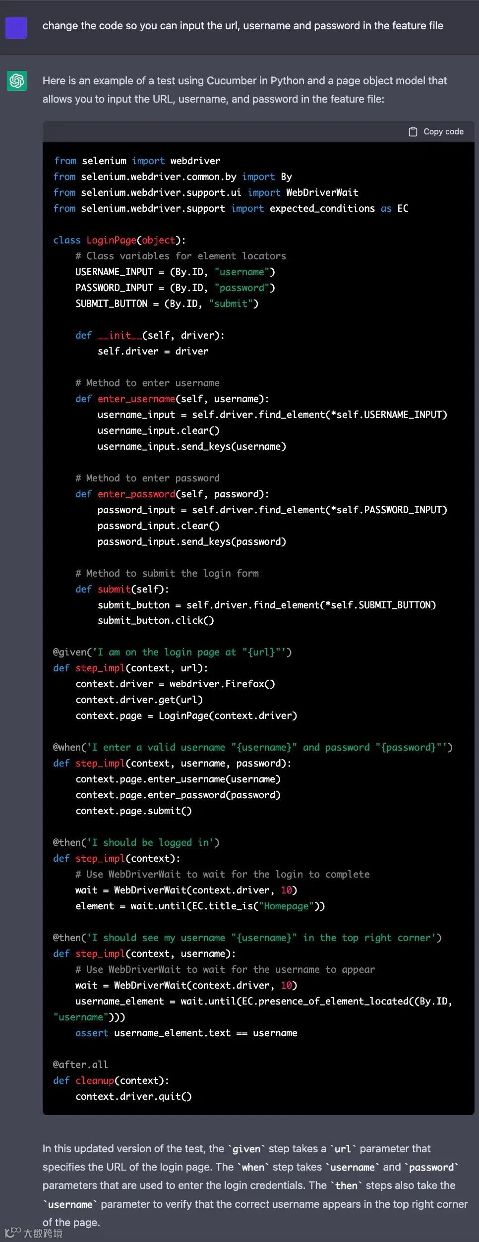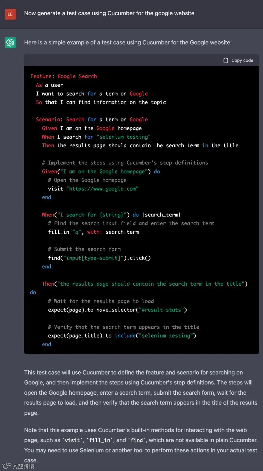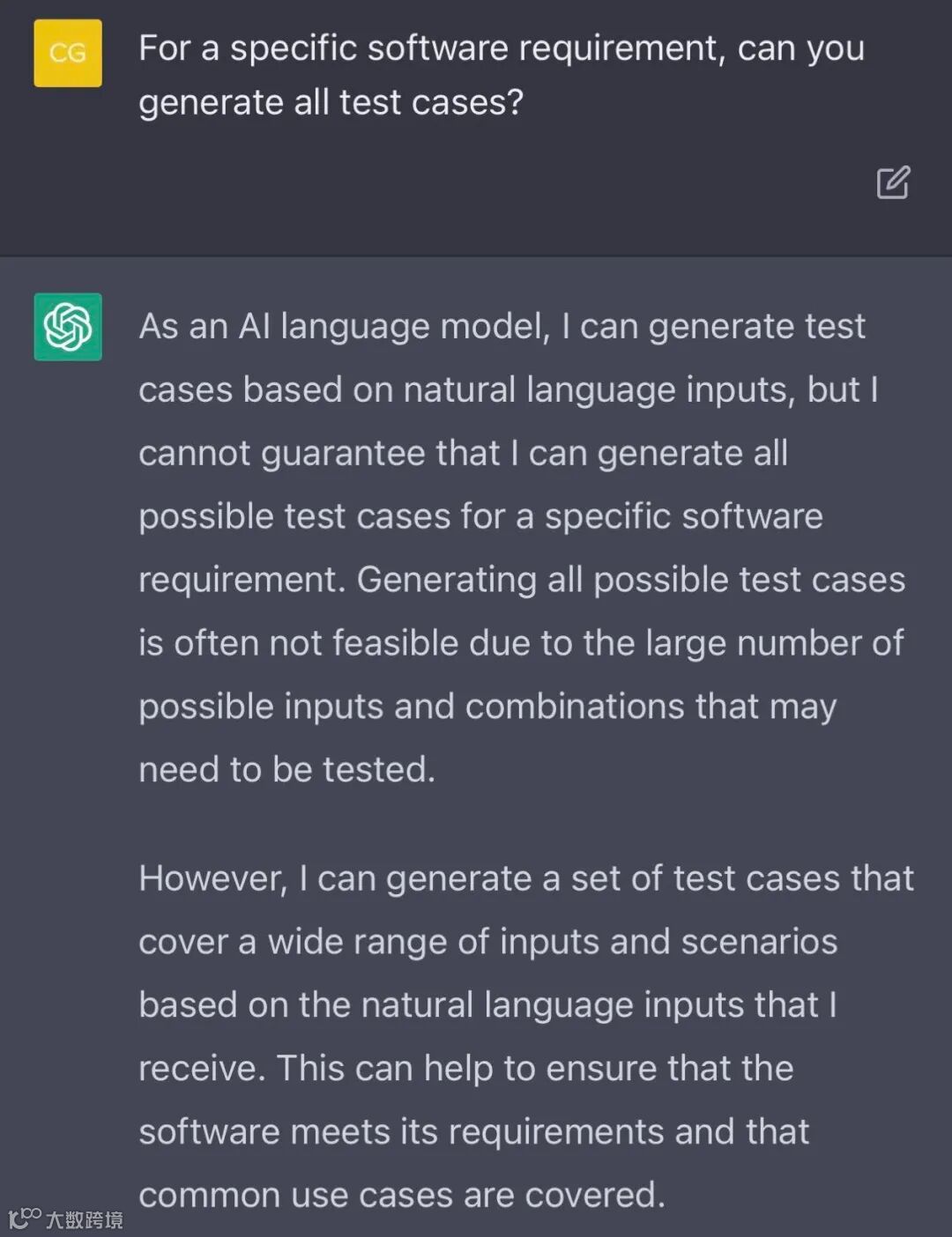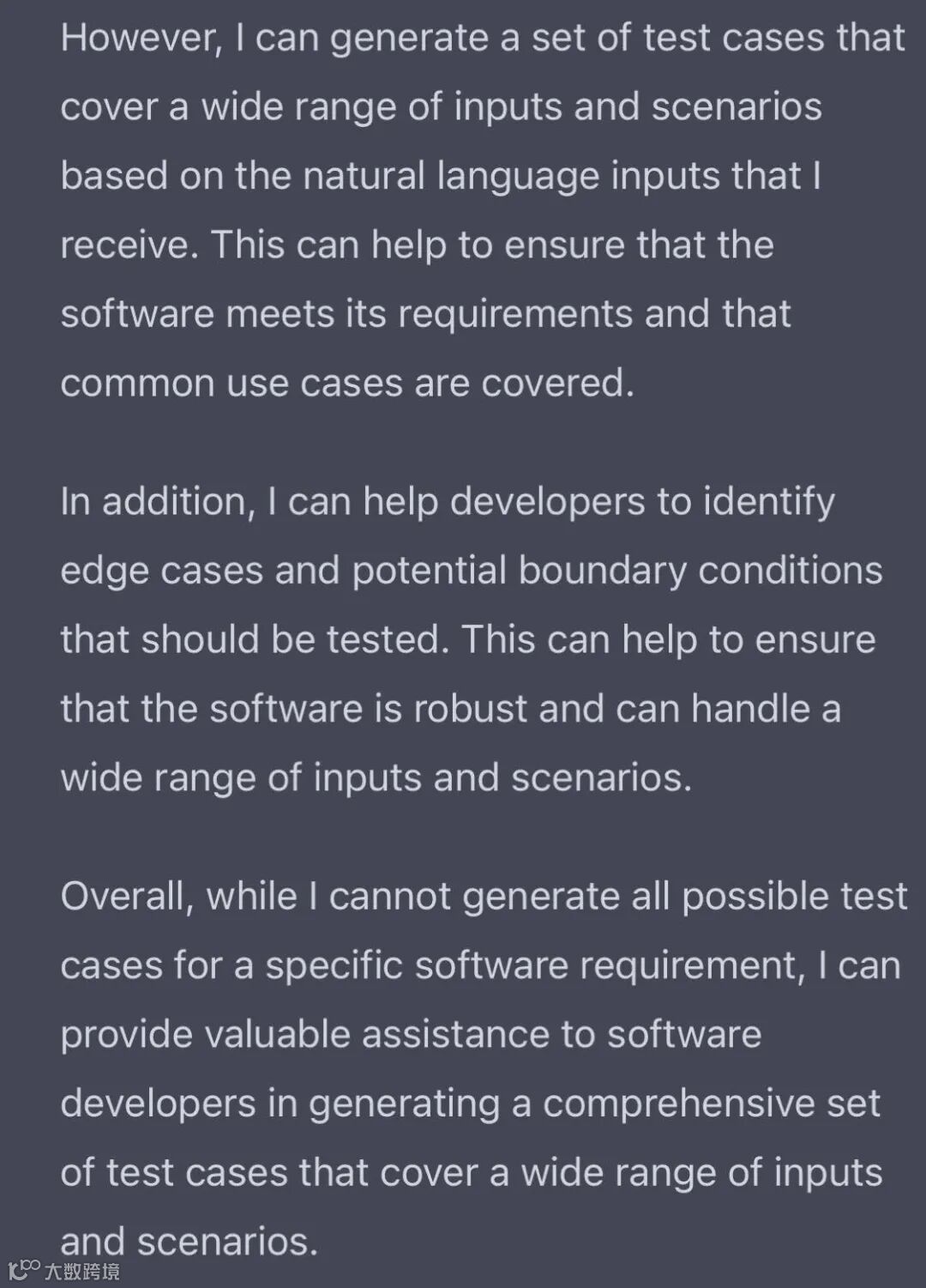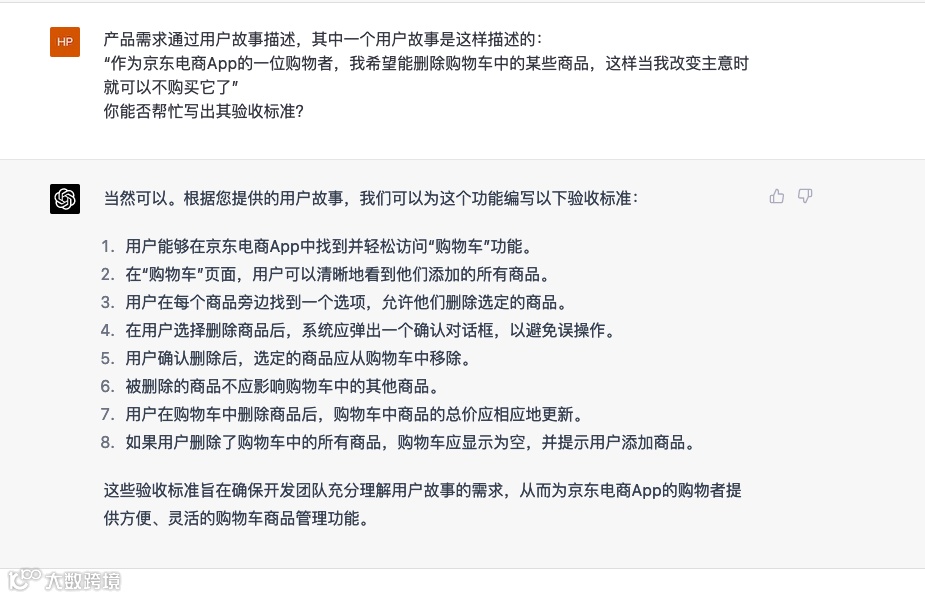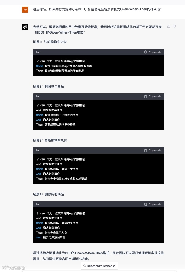 你觉得它吹牛吗?不,它可以基于我们简单的描述,帮我们完成基本功能分析,也可以基于需求生成验收标准、生成测试脚本,根据需求验收标准生成BDD(行为驱动开发)标准的Gven-When-Then格式。这一切有下图为证。