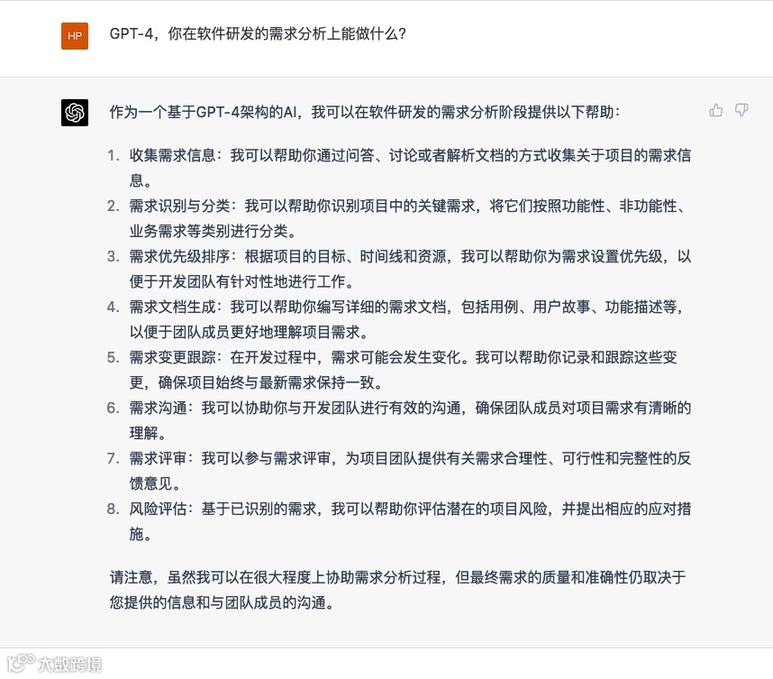 考虑到它的发展速度,在不久的将来,甚至从今天开始,AI就开始逐渐接手一些软件研发的工作,我们通过将GPT-4+(指GPT-4及其未来升级的版本)融入到软件研发生命周期中,研发人员的使命发生变化,GPT-4+重新定义了开发人员构建、维护和改进软件应用程序的方式,之后的软件开发会依赖这种全新的语言交流方式(类似chatGPT那样),让这类工具理解研发人员交待的任务、自主完成软件开发,如理解需求、自动生成UI、自动生成产品代码、自动生成测试脚本等。此后,研发团队的主要任务不是写代码、执行测试,而是训练模型、参数调优、围绕业务主题提问或给提示(prompt)。因此,我们说GPT-4将开启 “软件工程3.0” 新时代,今年是软件工程3.0元年。