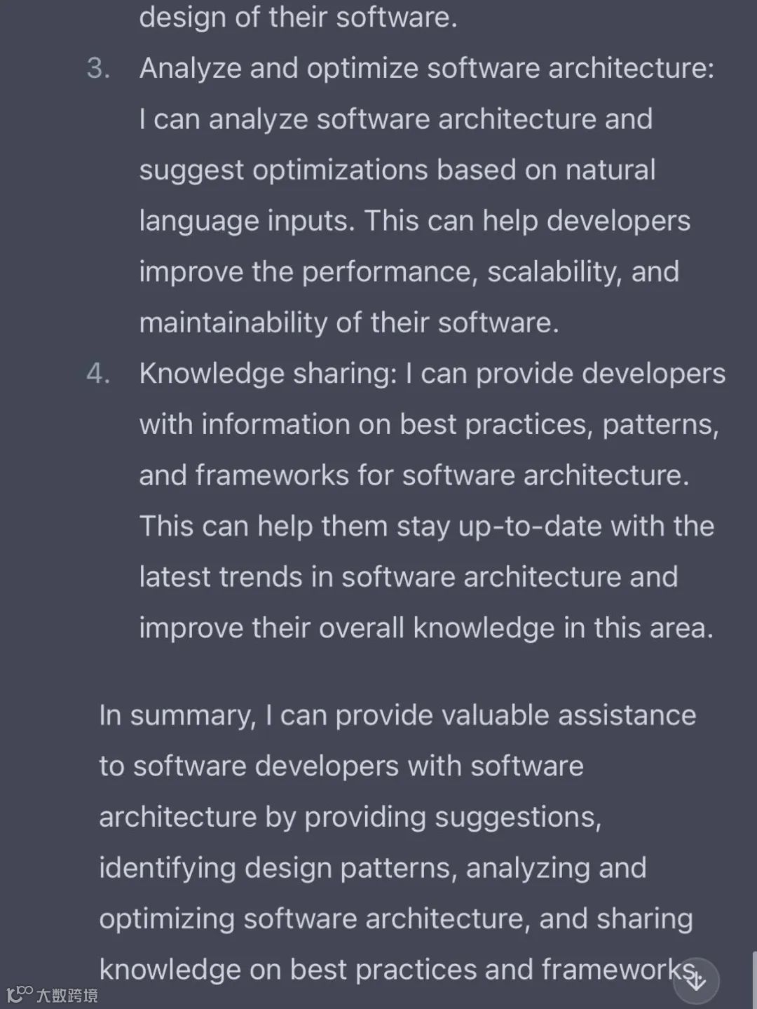 GPT-4的强大功能扩展到软件设计和架构,可以帮助开发人员做出明智的决策并制定健壮的解决方案。通过处理所需应用程序的高级描述,GPT-4可以提出合适的设计模式,推荐最佳实践,甚至建议最佳的体系结构选择。此级别的指导使开发人员能够创建可伸缩、可维护和高效的软件解决方案,以满足他们的特定需求。此外,GPT-4可以促进不同设计选项的评估和比较,确保开发人员选择最合适的前进路径。