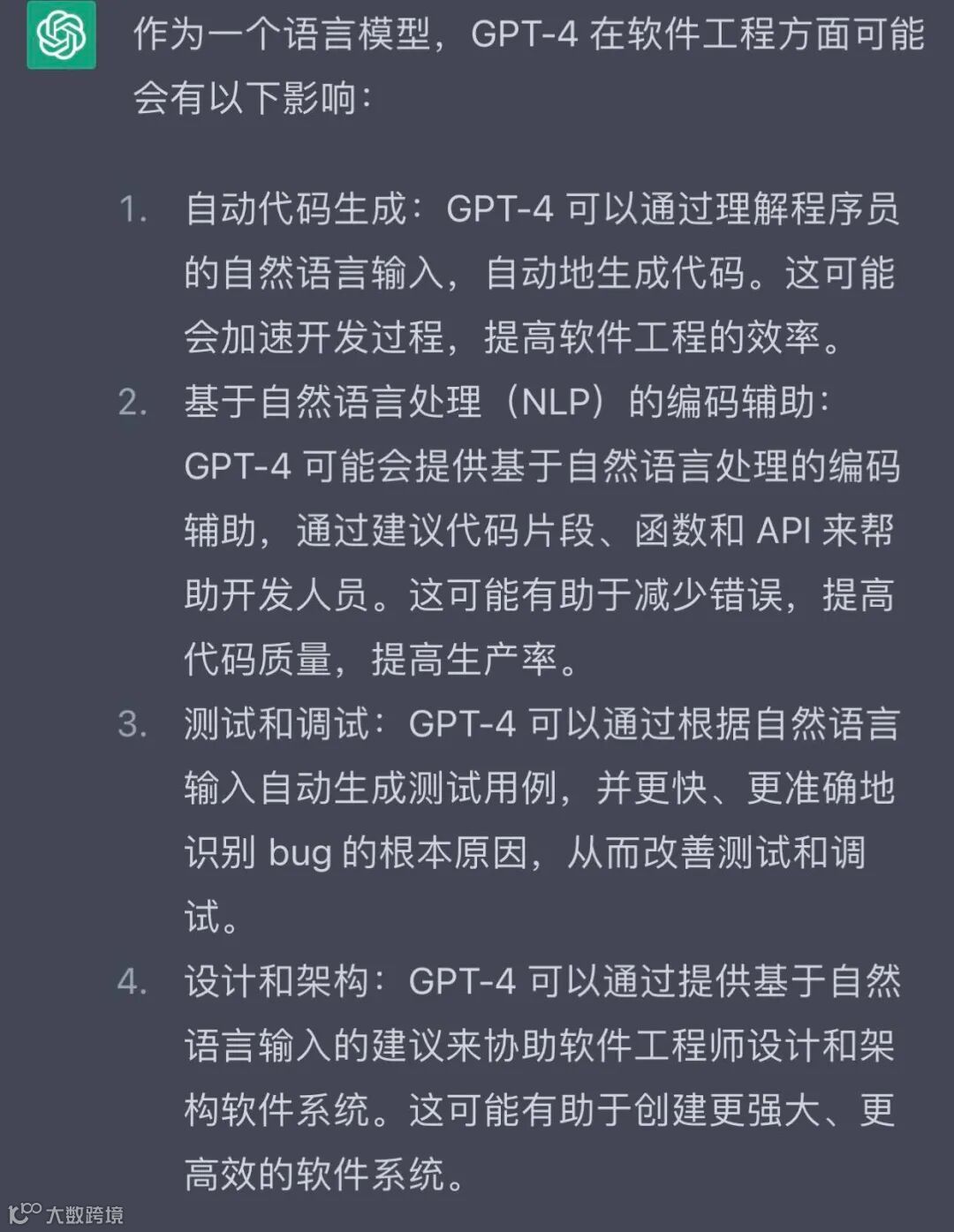 在技术突破和创新方法的推动下,软件工程的世界发展越来越快,而最近的突破就是GPT-4等人工智能(AI)语言大模型的出现。GPT-4出来了,大家都很震惊,尤其惊讶于从GPT-3到GPT-4的进化速度。GPT-4是一种基于RLHF(人类反馈强化学习) 、多模态的语言大模型,它比其前身GPT-3.5有了显著的改进,GPT-4具有强大的识图能力、文字输入限制提升至 2.5 万字、回答准确性显著提高。因此GPT-4能够执行一系列复杂的任务,如代码生成、错误检测、软件设计等。正如文章谷歌工程主管:程序员的职业生涯将在 3 年内被AIGC终结中的观点:“ChatGPT和GitHub Copilot预示着编程终结的开始”、“这个领域将发生根本性的变化”、“当程序员开始被淘汰时,只有两个角色可以保留:产品经理和代码评审人员。”...... 这篇文章是在GPT-4发布前写的,而GPT-4要强大多,所以对软件研发的影响更为显著。