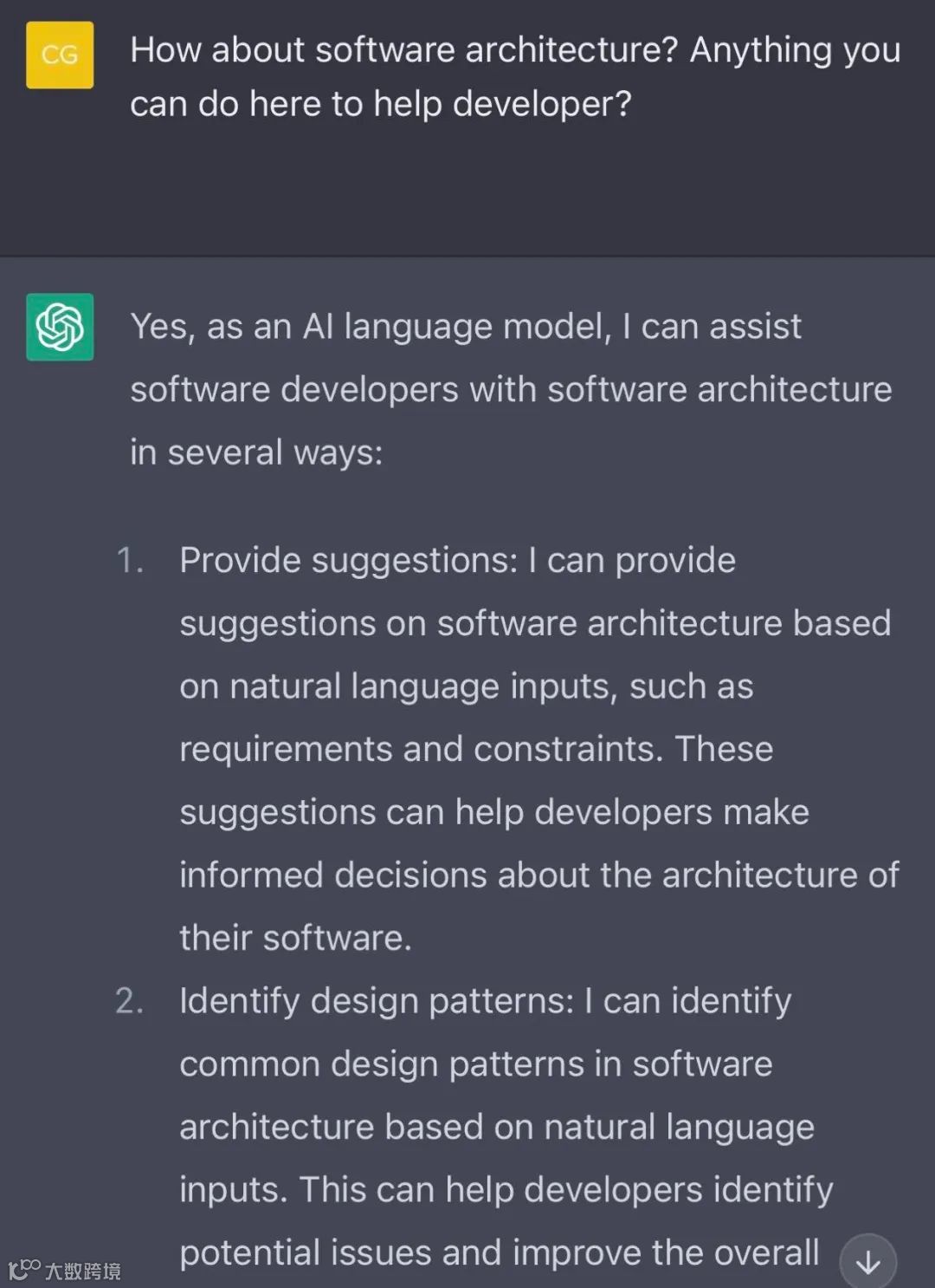 GPT-4能根据自然语言输入的需求及其上下文而生成代码,而且可以用不同的编程语言生成相应的代码。这一强大的特性减少了人工编码所花费的时间和精力,并支持快速原型化和概念验证开发。此外,GPT-4能够生成代码段、api,甚至整个软件模块,使开发人员能够轻松地创建复杂的应用程序。甚至可以帮助我们按敏捷开发模式推崇的TDD来完成代码的实现。