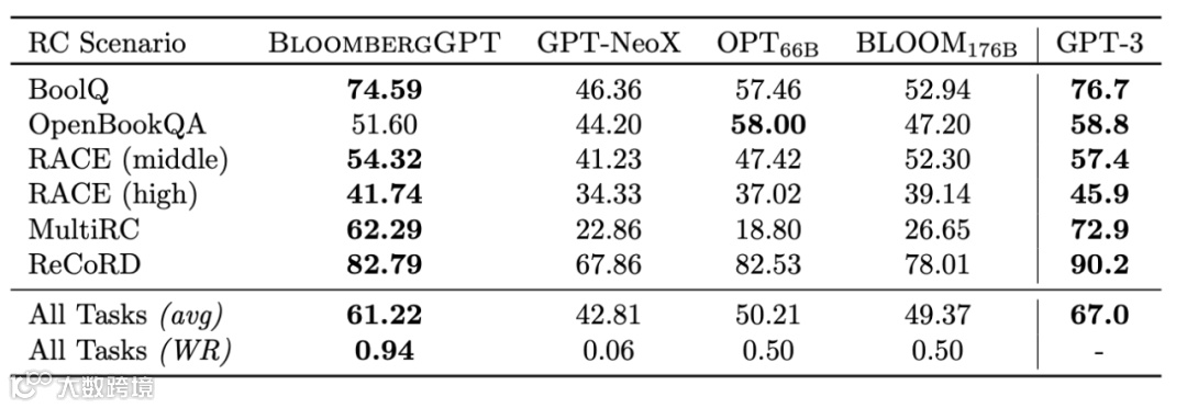 大量的、高质量的垂直领域知识(从金融数据集 FINPILE获得的)可以弥补模型在规模上的不足。通过对 BloombergGPT和GPT-3的对比,虽然 BloombergGPT的模型参数相对于GPT-3来说是比较小的,但是由于 BloombergGPT的预训练数据增加了大量的高质量的金融数据,并且对预训练数据进行了一系列的清洗和标注,所以 BloombergGPT在通用性和GPT-3基本持平的前提下,实现了对金融垂直能力的大幅提升。这也说明当参数尺度一定时,高质量的数据才是决定模型性能的关键因素。