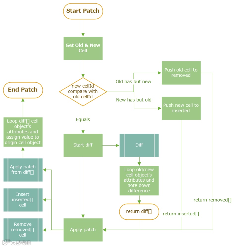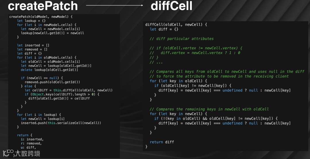 这个是 Diff/patch 核心的算法实现,大家可以简单的过一下。首先拿到每一个对象,创建一个节点就会创建新的对象,跟对端对比,我们可以看到中间是不是多了?如果多了就会处理,如果有更新的操作,我们开始 Diff 出来然后形成一个 patch。核心的算法是这样不断的循环的,因为我们数的结构最大的优点是永远不会循环死锁。