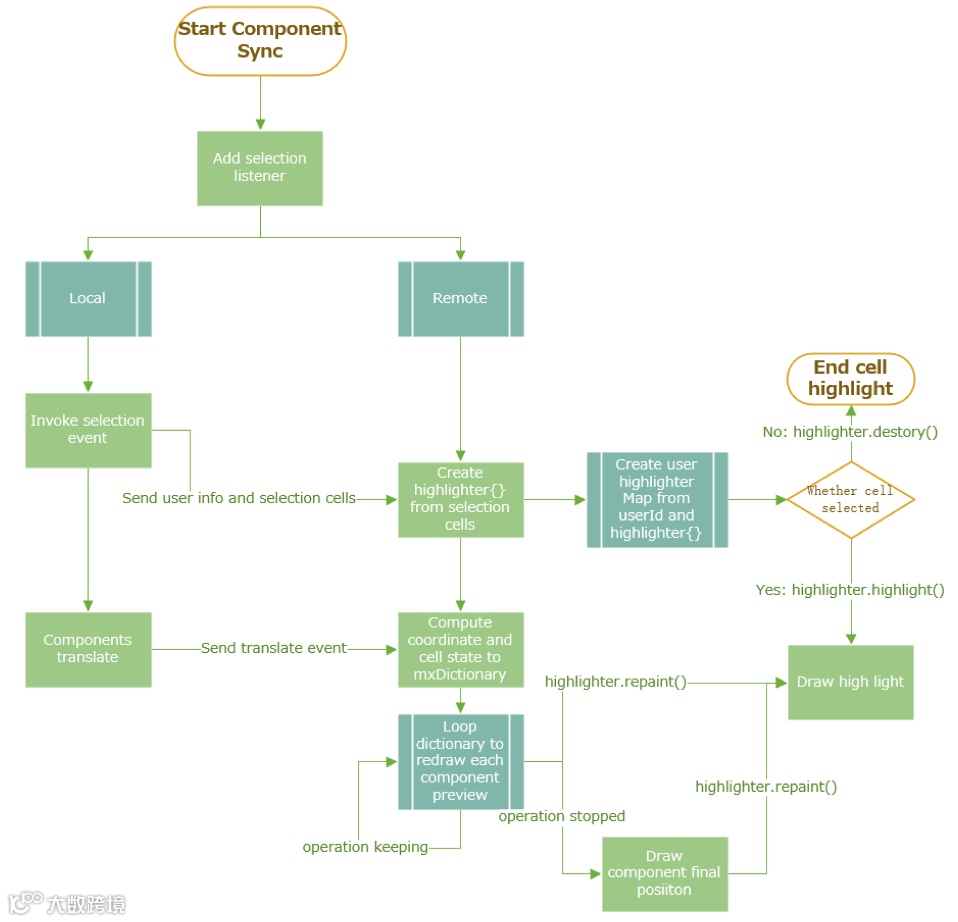 这个动画的拖拽效果也有非常详细的流程,我们的模式是增加一个选择的监听,本地把这些监听发送到云端,对端开始接受,接受之后创建一个专门的队列,每一端的操作都有一个对应的队列,这样整个体系里面会把每个端的高量全部渲染出来。之后再进行计算处理。